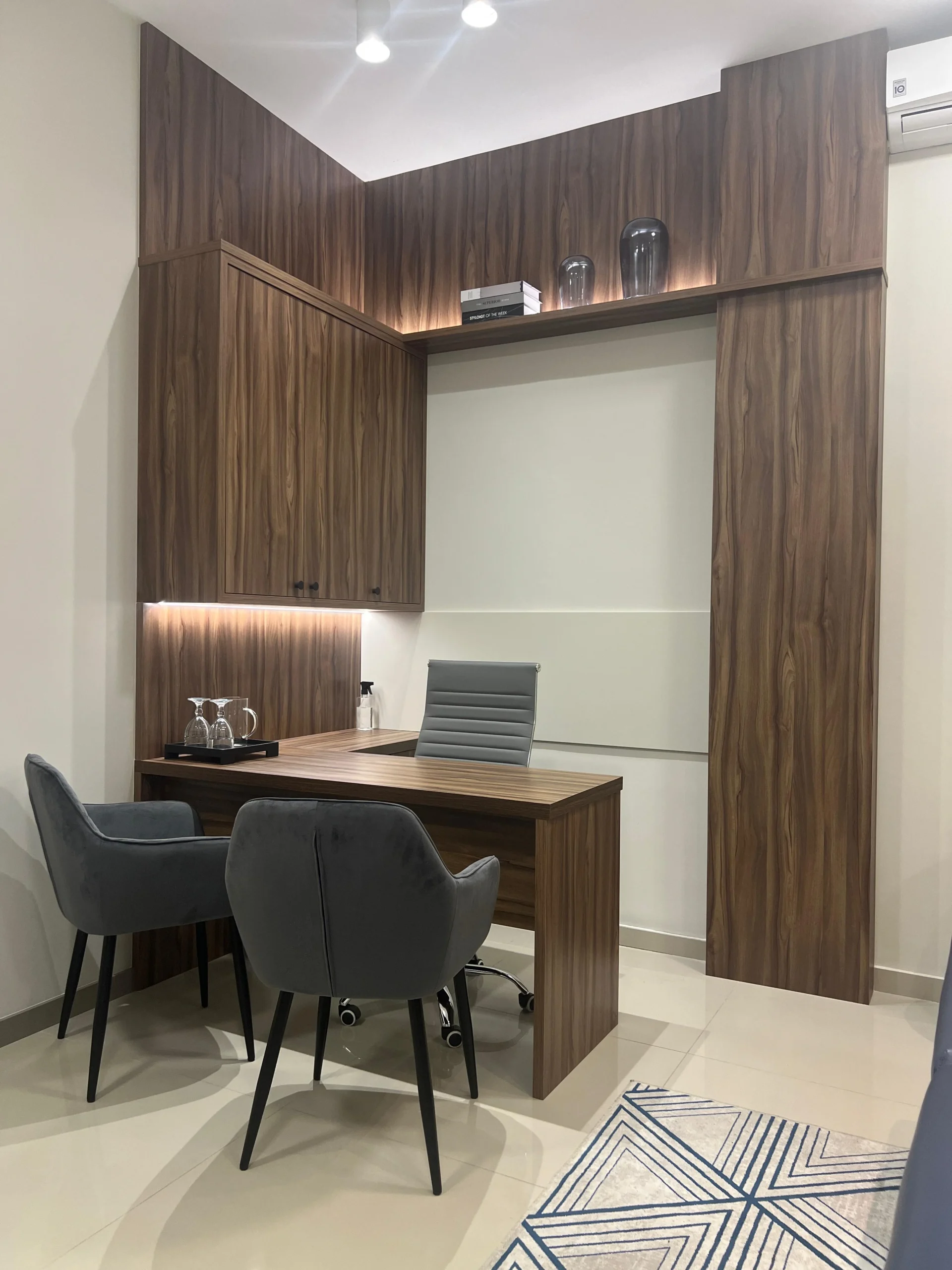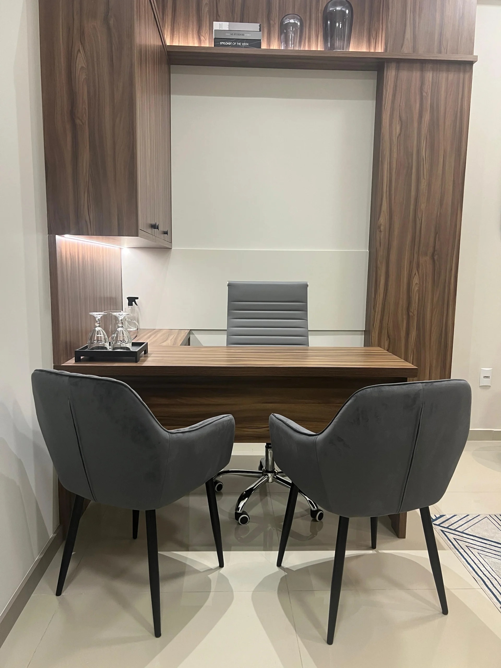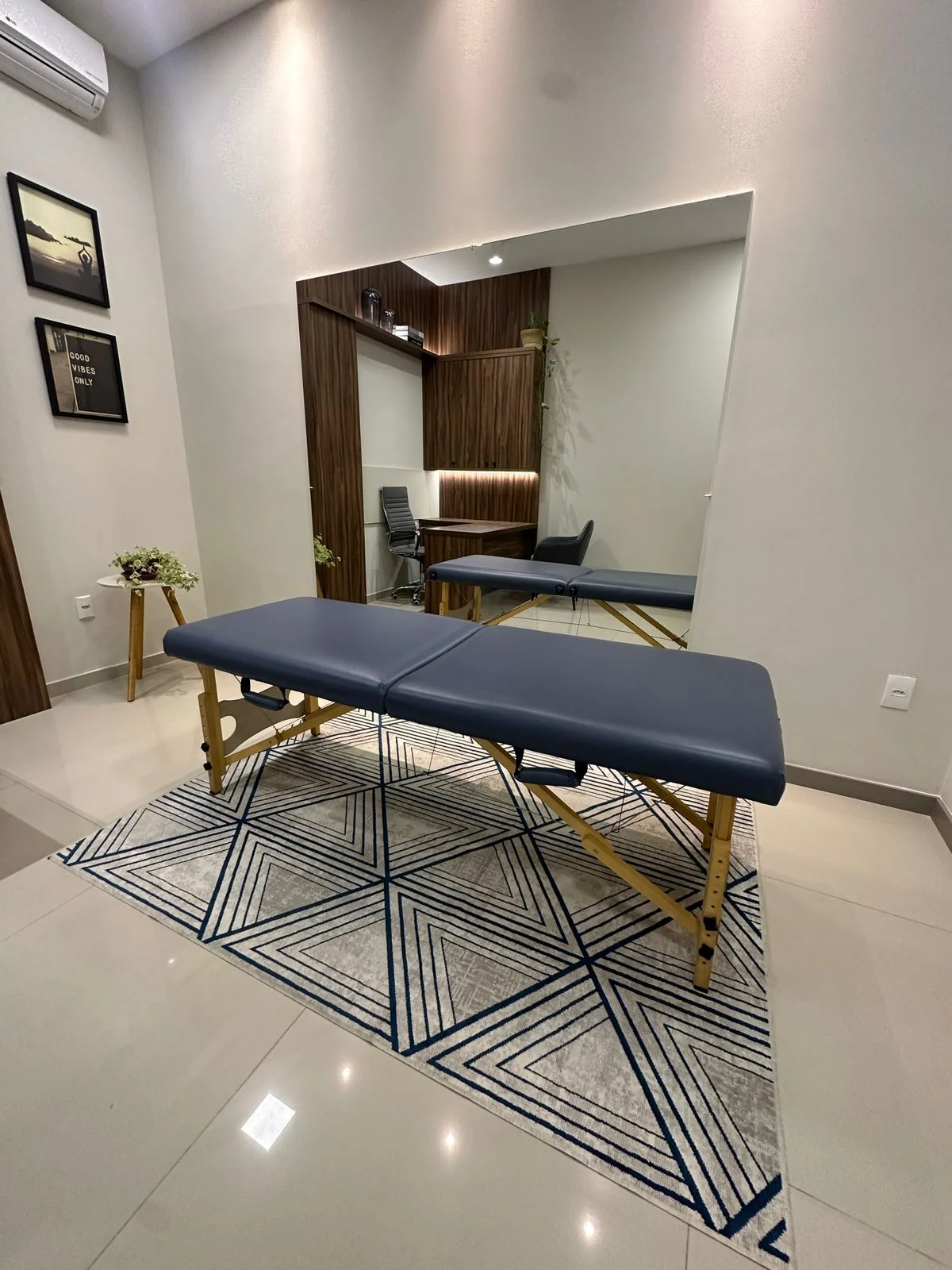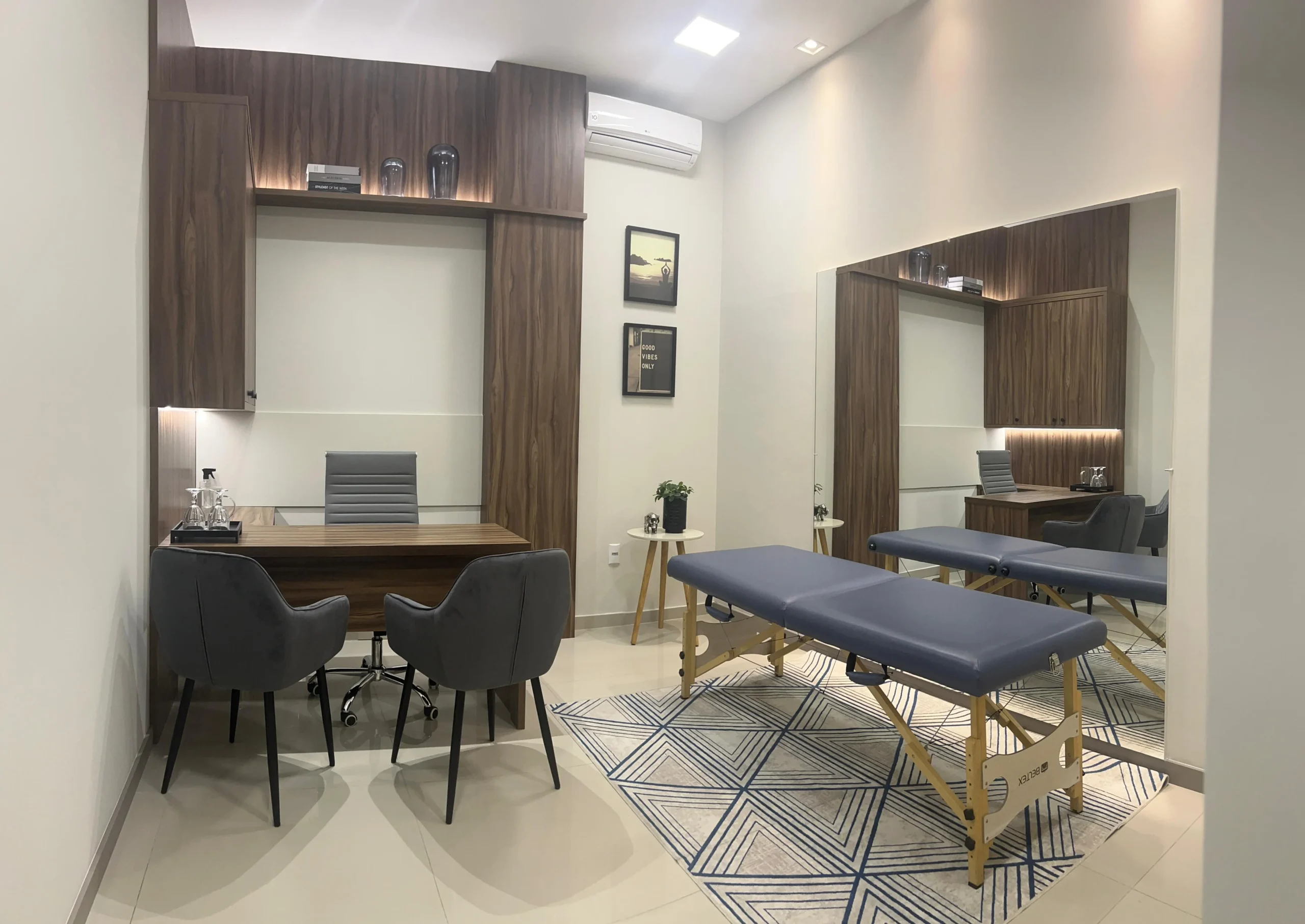 Com uma maca confortável, mobiliário em madeira premium, iluminação suave, poltronas acolhedoras e um espelho amplo que amplia a sensação de espaço, a sala oferece uma atmosfera elegante e ao mesmo tempo íntima.